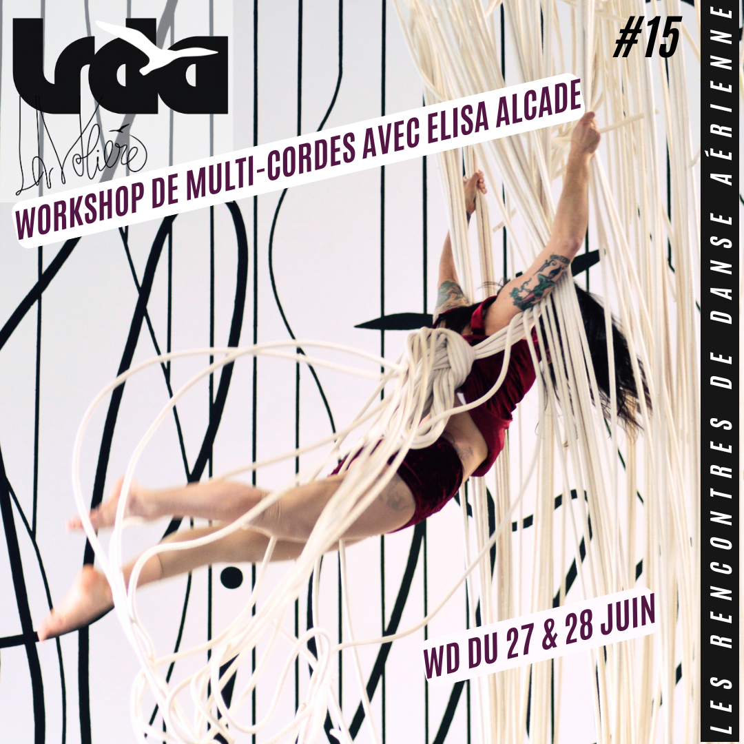 Workshop sur 2 jours, mené par Elisa Alcade (de la Cie Appesa) propose une exploration chorégraphique et plastique des agrès aériens réalisés en fibres de lin et des multi-cordes. Le travail s’articulera autour de la physicalité du corps et de la qualité plastique du mouvement, en mettant l’accent sur l’écoute, l’intuition et la composition instantanée. Nous explorerons comment la matière réagit, se transforme et influence le geste, comme si elle était une matière vivante avec laquelle dialoguer. Le workshop laissera également une place importante à l’intuition, à la créativité personnelle et à l’échange entre participant·es, afin de favoriser l’émergence de matériaux chorégraphiques singuliers. *** This workshop, led by Elisa Alcade, offers a choreographic and visual exploration of aerial apparatus made from linen fibers and multi-ropes. The work will focus on the physicality of the body and the visual quality of movement, emphasizing listening, intuition, and spontaneous composition. We will explore how the material responds, transforms, and influences the gesture, as if it were a living substance to engage in dialogue with.The workshop will also give significant space to intuition, personal creativity, and exchange between participants, encouraging the emergence of unique choreographic material. DATE & HORAIRES / TIME: Samedi 27 juin de 14h à 17h & Dimanche 28 juin de 10h à 13h Saturday, June 27, 2 PM – 5 PM & Sunday, June 28, 10 AM – 1 PM PUBLIC / AUDIENCE : Amateur.es initié.es & professionnel.les / Amateurs & Professionnals