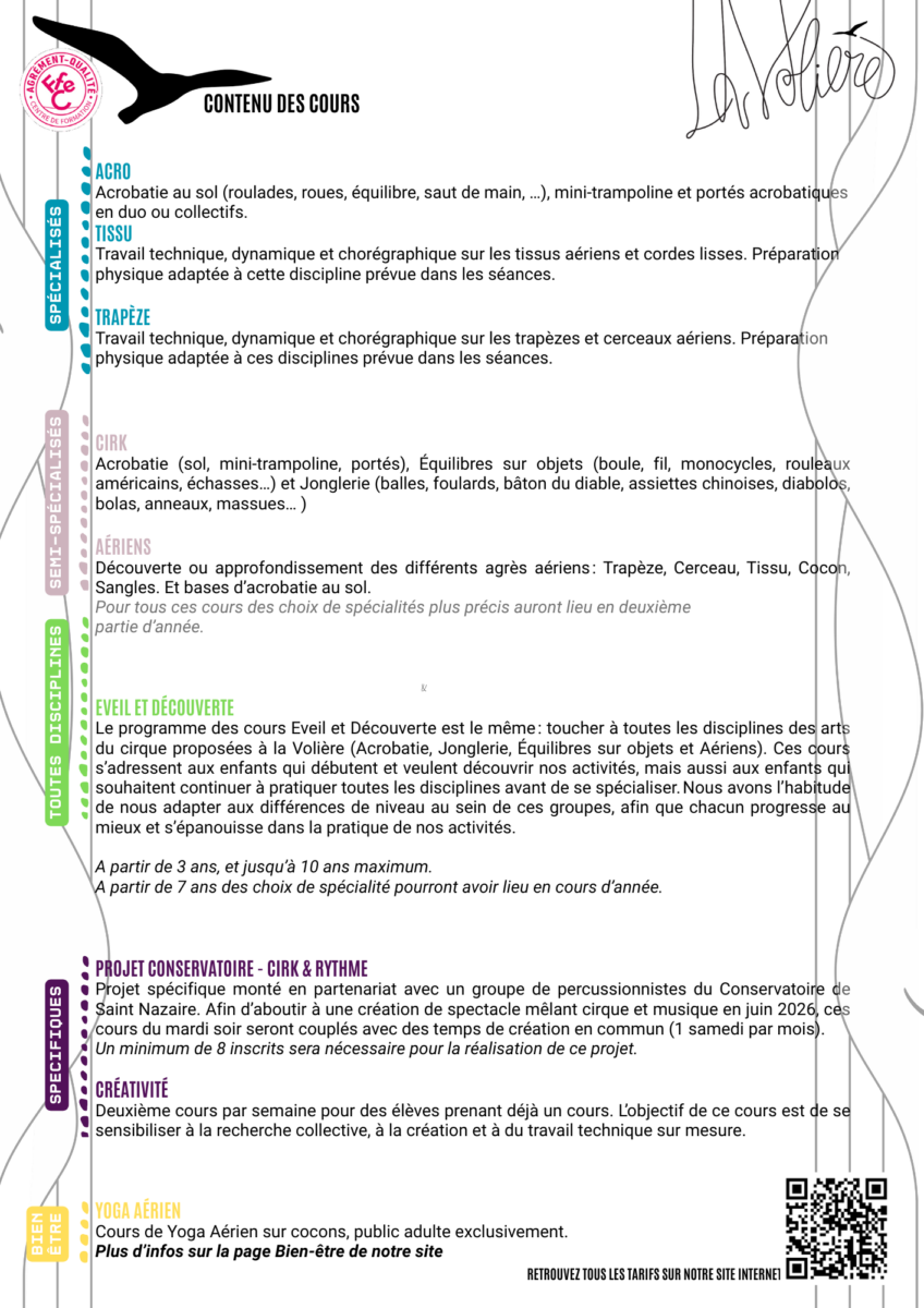La Volière est adhérente de la Fédération Française des Ecoles de Cirque (FFEC) depuis son ouverture en 2020 et a obtenu l’agrément qualité « pratique amateur » de la fédération en juin 2022.